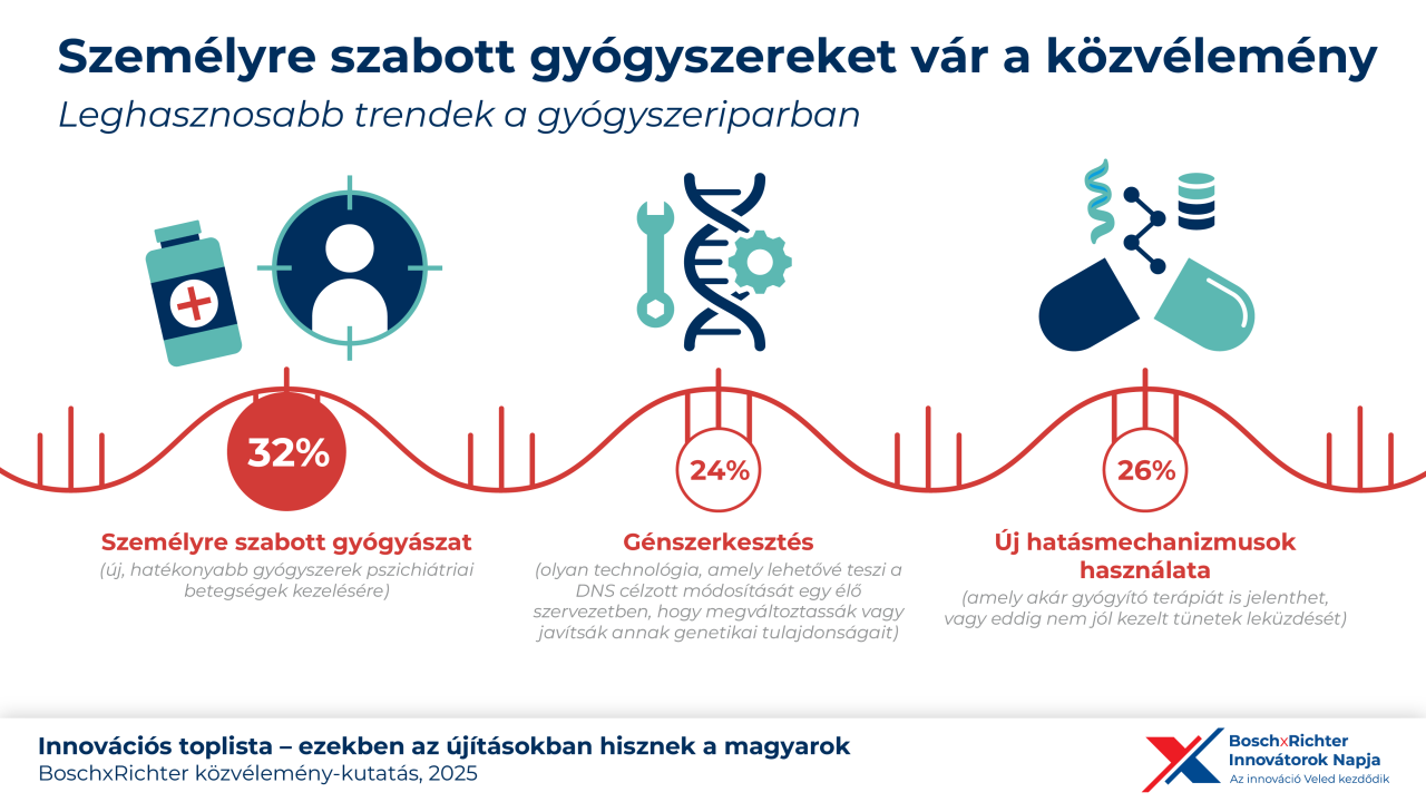 A közlekedés és a gyógyszeripar jövőjével foglalkozott a magyarországi Bosch csoport és a Richter Gedeon Nyrt. "Innovációs toplista: ezekben az újításokban hisznek a magyarok" című kutatása, melynek friss eredményeit a BoschxRichter Innovátorok Napja konferencián mutatta be közösen a két hazai nagyvállalat 2025. szeptember 23-án a Bosch Budapest Innovációs Kampuszon.